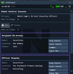 На каждой станции присутствует от одного до трех охранных дронов — Бипски. Вы можете управлять их настройками, а также призвать оных к себе, что в некоторых случаях бывает крайне полезным. Помимо этого, в них возможна установка ПИИ. Робототехники могут сделать еще больше Бипски, а также построить ЕД-209 с более эффективным снаряжением. Обычно они патрулируют коридоры, охраняют арсенал или спутник ИИ. Некоторые из них имеют иные параметры, что отличаются от патрульных, они настроены на охрану конкретной местности и набросятся на любого с недостаточным доступом. Бипски будут автоматических уведомлять в канал связи безопасности о проводимом задержании.