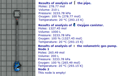 Each pipeline have a gas mixture, each individual member of the pipeline gets a share of this big gas mixture based on how much their share of the total volume is. Lets take the picture on figure 3.2 as an example. Notice that the pressure is preserved on all the analyzed machineries, demonstrating that once again: the gas is being shared equally between all of them based on their respective volume. This is what the supermatter guide refers to as gas directly appearing in the two ends of the pipeline as wide as the observable universe. Keep this concept of gas sharing in mind!