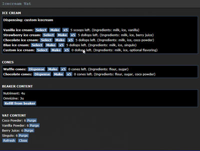 For those hot days on the station there's an Icecream Vat, which can be used to make icecream. You do this by first clicking the Icecream Vat to open a window. To create an icecream, you must first dispense a cone. Then you click "select" next to the icecream type you want to put into the cone. Then you click the vat while holding the cone in hand.